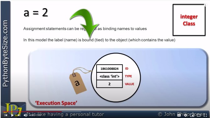 a = 1 // An object with a value of 2 is created b = a // b is bound to the same object as a. // Because Python creates a new object only if the value is different. id(a) // ---> 123, The IDs of both variables are the same. id(b) // ---> 123. Both are bound to an object with the same value. id(a) == id(b) // ---> TRUE. Compare by value. b = 3 // Assign new value to b. Meaning a new object is created (new ID). id(b) // --->789 id(a) == id(b) // ---> FALSE. The variables are bound to two different objects