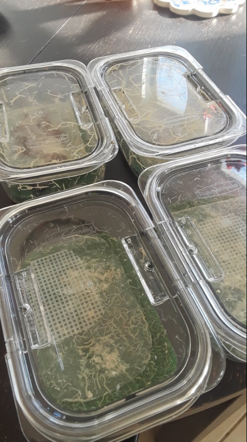 What you see on the pictures below is two two week-old boxes and two two-day-old boxes. All of them were seeded with worms from my existing coco coir boxes that are just about to crash (waste accumulation).